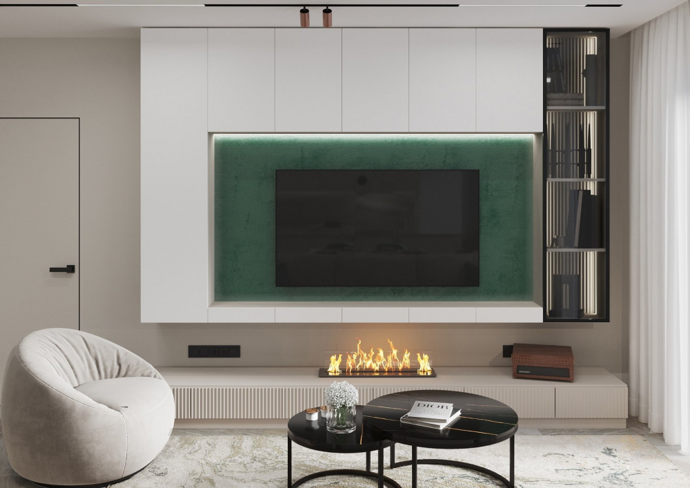 Идея №3. Зона с телевизором – это неизменный атрибут любой гостиной, но в новых интерьерах ее можно дополнить биокамином с настоящим огнем.