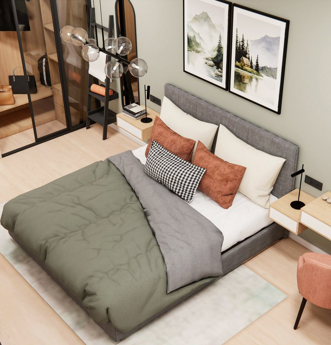 Такой вариант расстановки мебели часто используют в небольших пространствах. Для этого кровать устанавливают напротив двери.