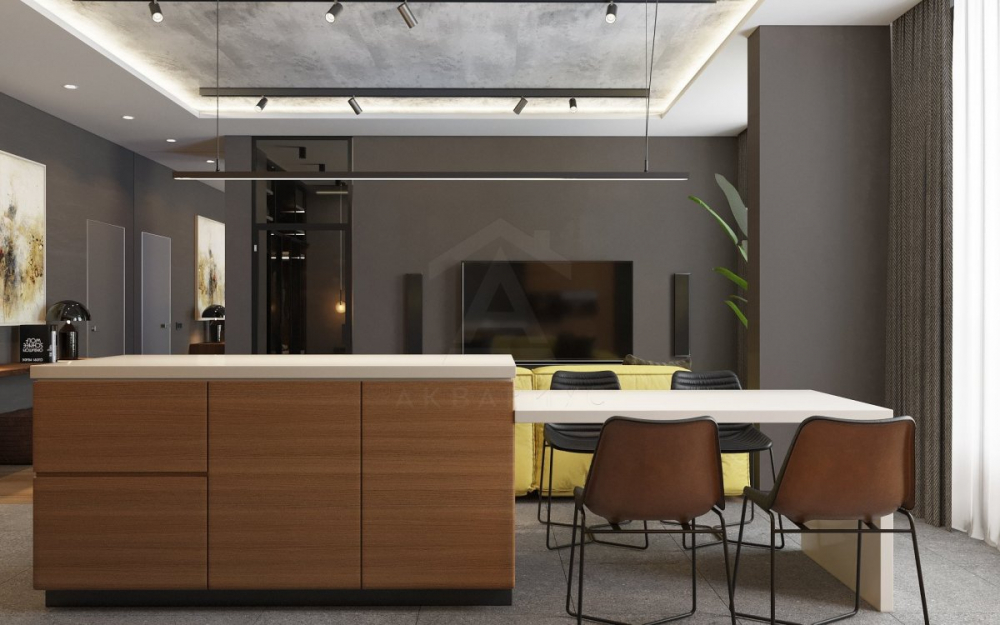 Фото: Двухуровневый потолок ГКЛ в интерьере кухни-гостиной