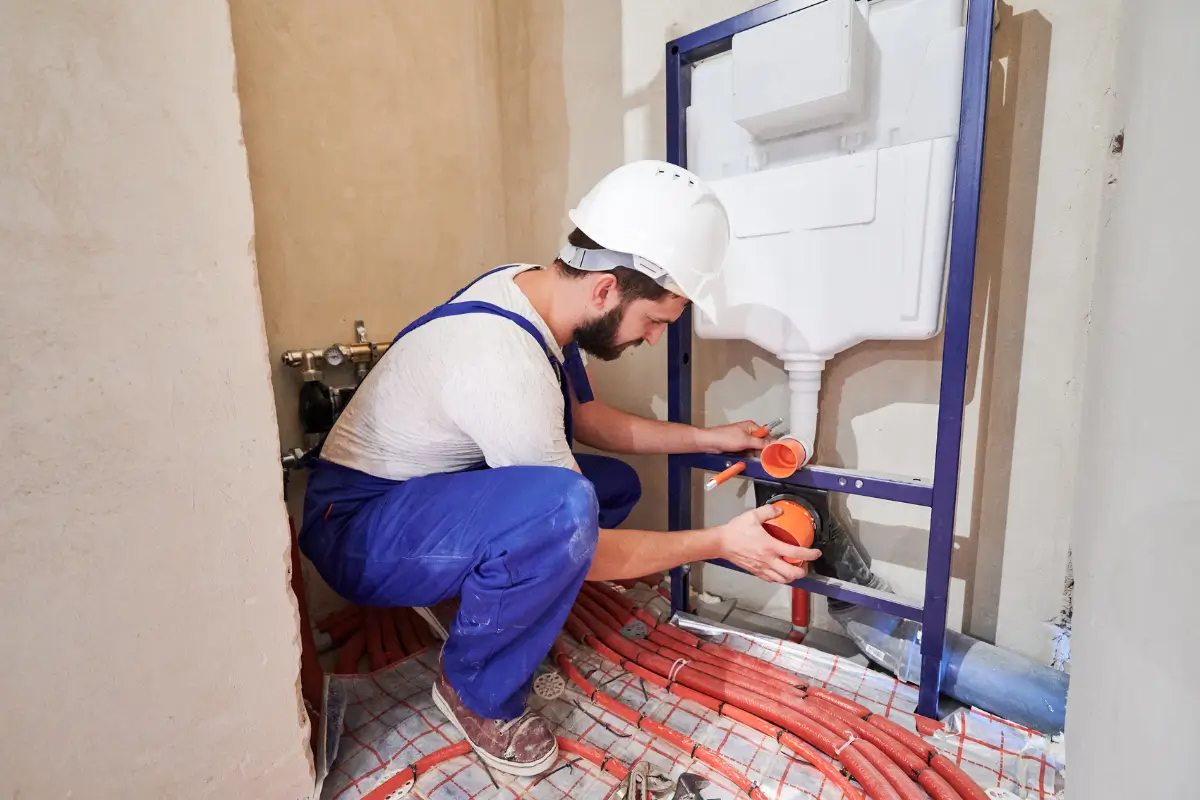 Инсталляцию устанавливают на этапе черновых работ. Сначала нужно определиться с местом установки инсталляции. Подвесной унитаз должен находиться максимально близко к канализационному стояку. Если нужно поставить инсталляцию на расстоянии, тогда следует обеспечить уклон сливного отвода на 2-3 см на каждый погонный метр. Если этого не сделать, сточные воды будут медленно проходить в сливной стояк.