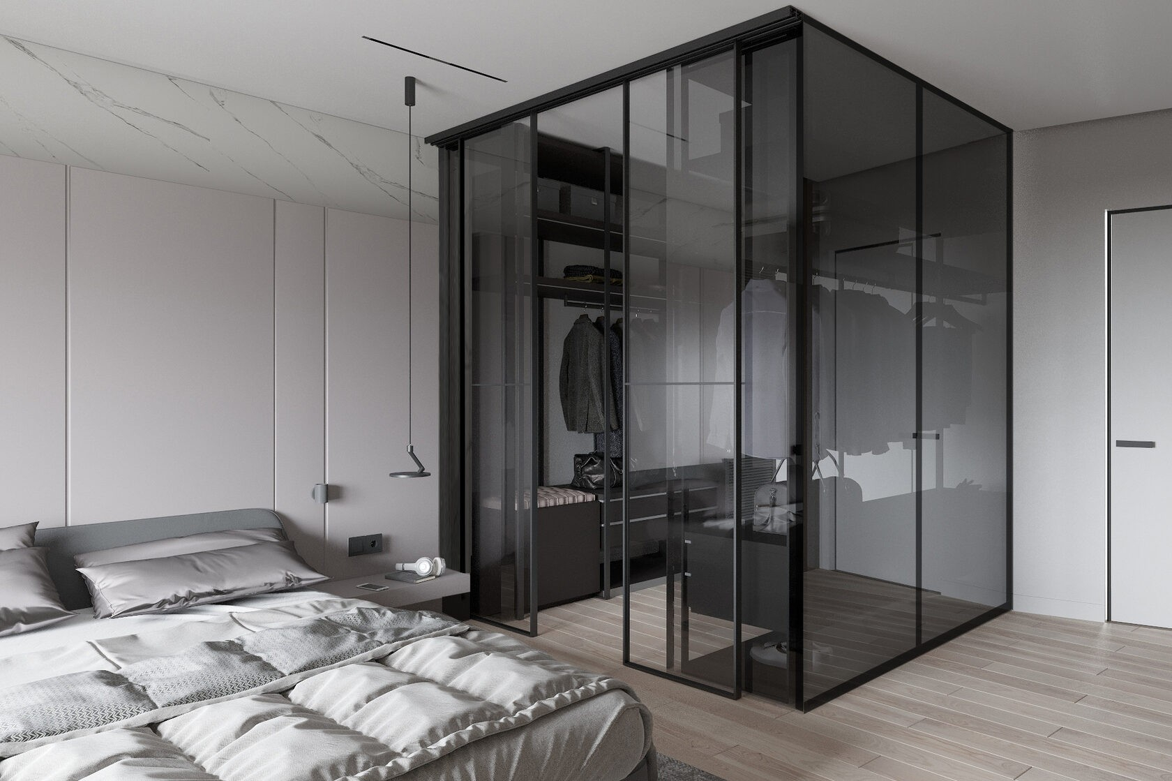 Интересная идея гардеробной комнаты для любителей минимализма. Часть спальни закрывают стеклянными перегородками и оборудуют там места для хранения.