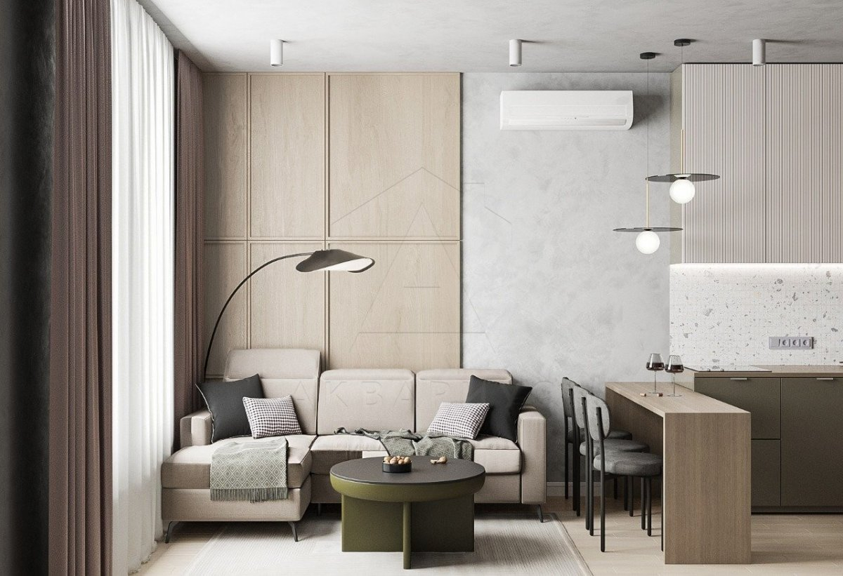 В этом дизайне гостиную объединили с кухней, а пространство поделили на зоны с помощью мебели. Над кухонным столом установили свисающий светильник. В качестве основного цвета использовали серые оттенки на стенах и потолке. Вспомогательным стал цвет под дерево.