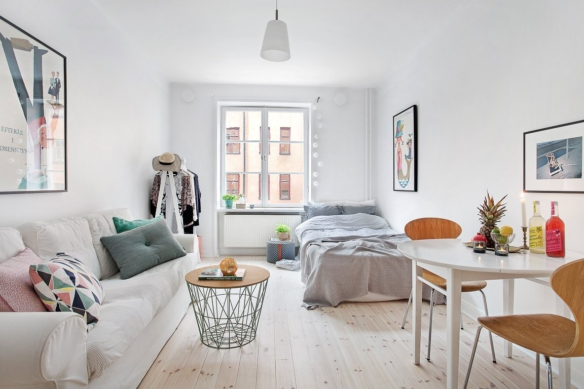 Подойдёт владельцам маленьких квартир, которые любят простоту. В сканди даже студия может выглядеть просторной.