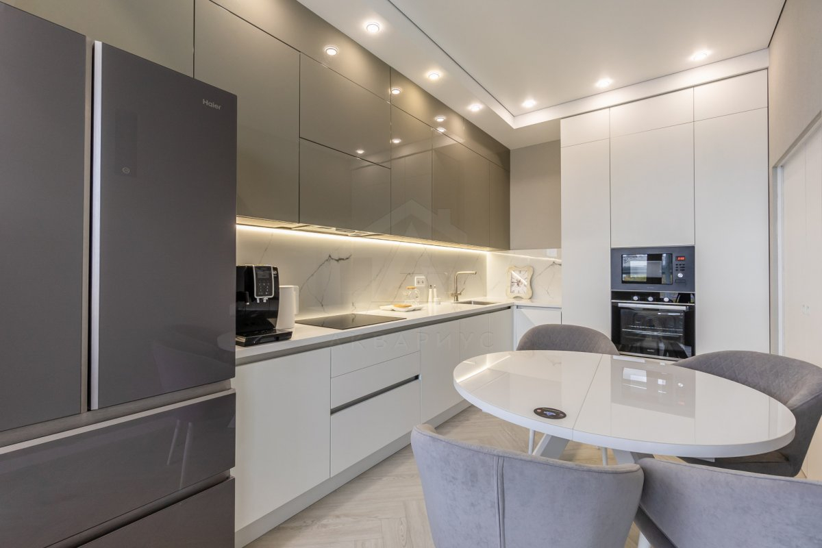 Фото: Двухуровневый потолок ГКЛ в интерьере кухни-гостиной