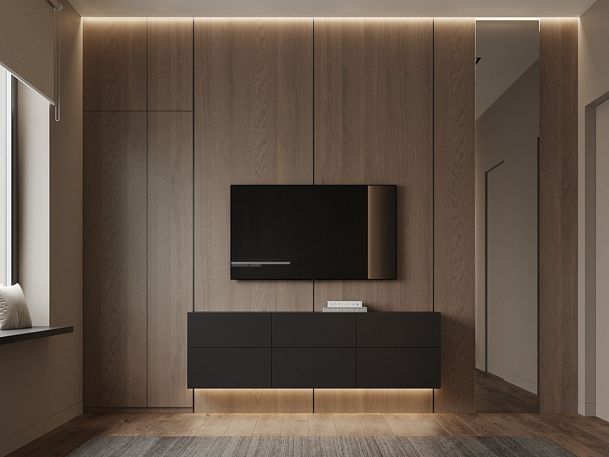 Стену напротив кровати на визуализациях сделали с вертикальными линиями.Их отобразили на визуализациях с максимальной детализацией.