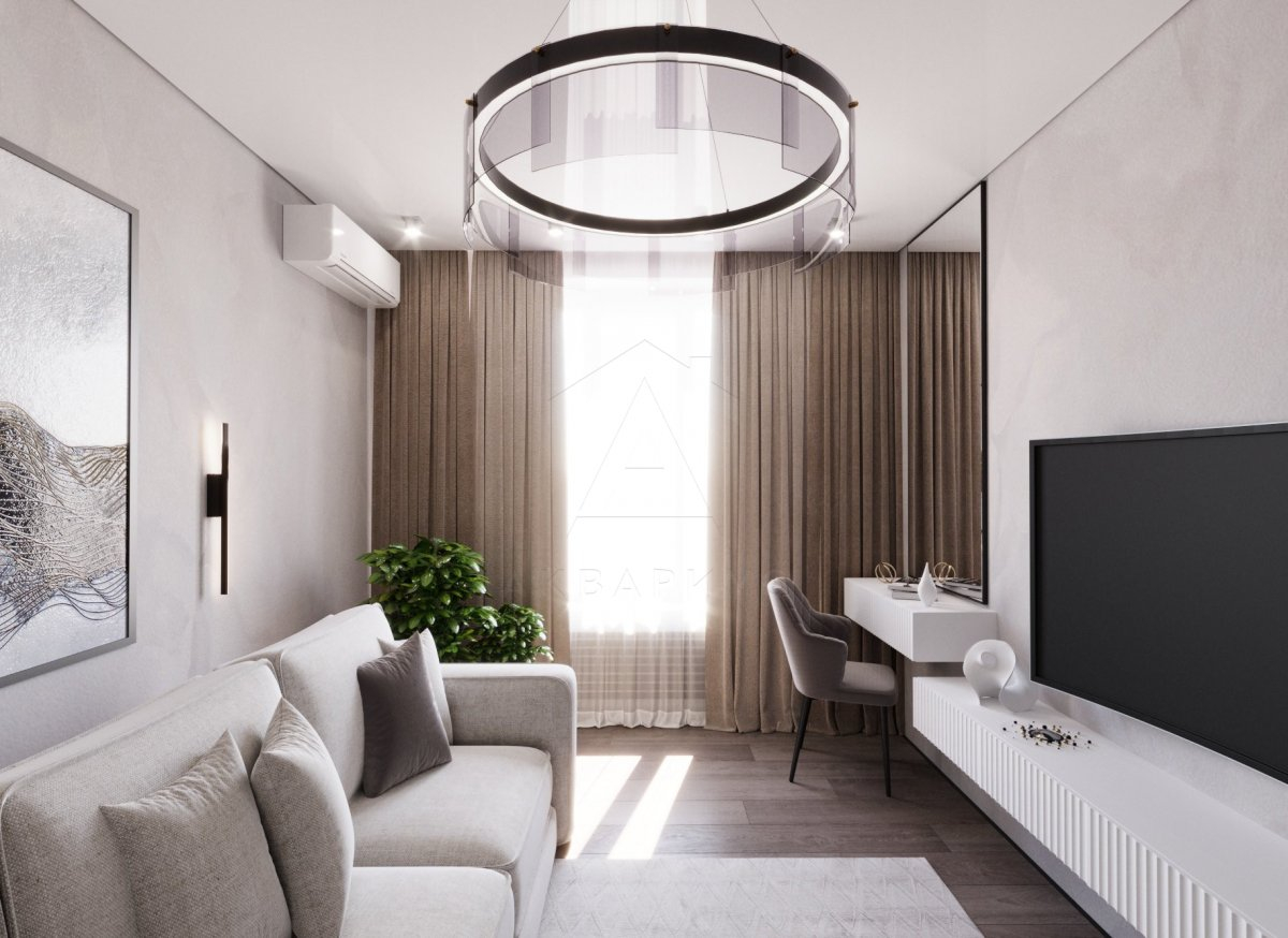 Тут шторы сделали в цвет дивана. Карниз выбрали во всю стену, чтобы пространство получилось более камерным.