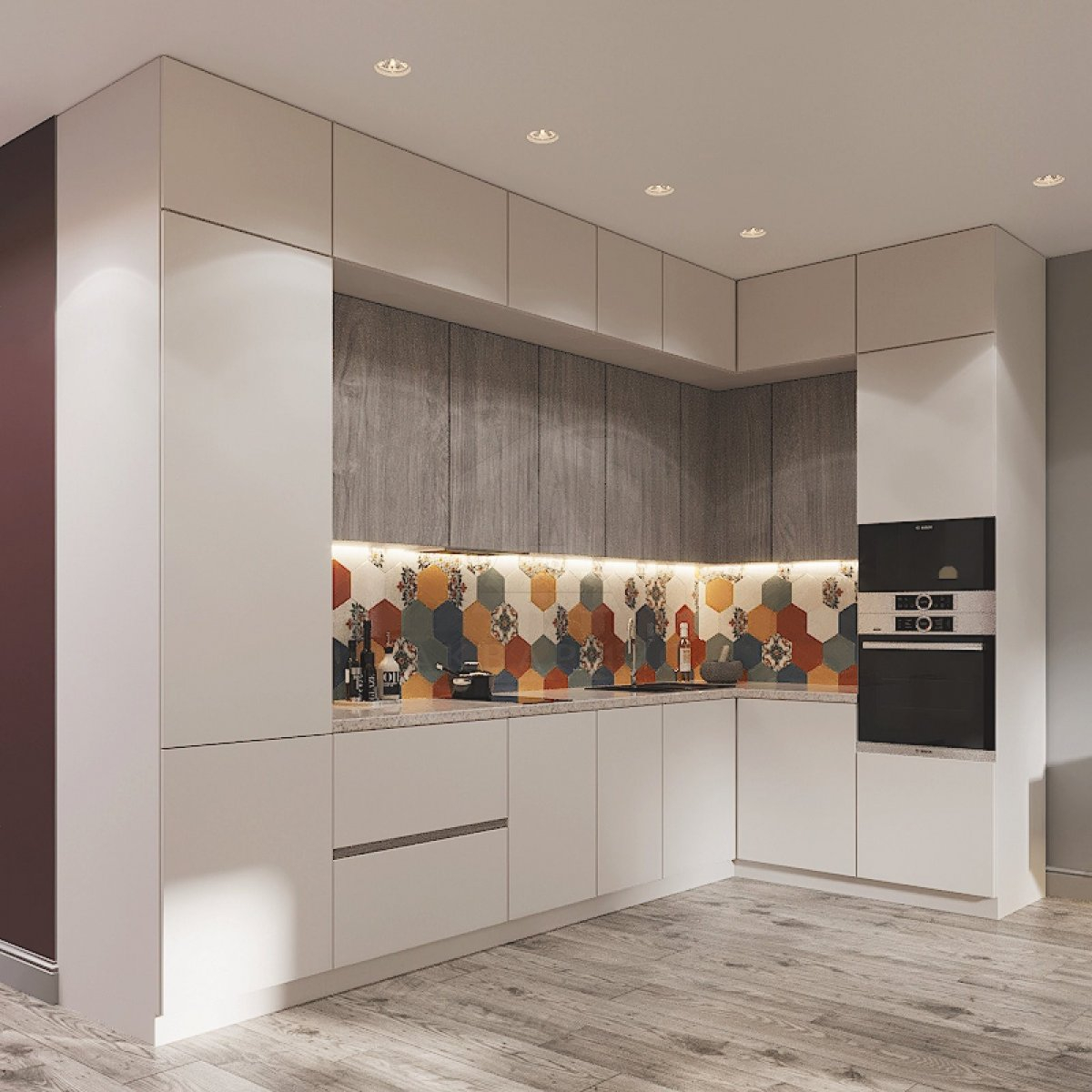 При грамотном сочетании мозаичная плитка помогает создавать потрясающие геометрические узоры. Например, можно чередовать квадратные и шестиугольные мозаичные плитки, чтобы создать необычный геометрический дизайн на кухонном фартуке.
