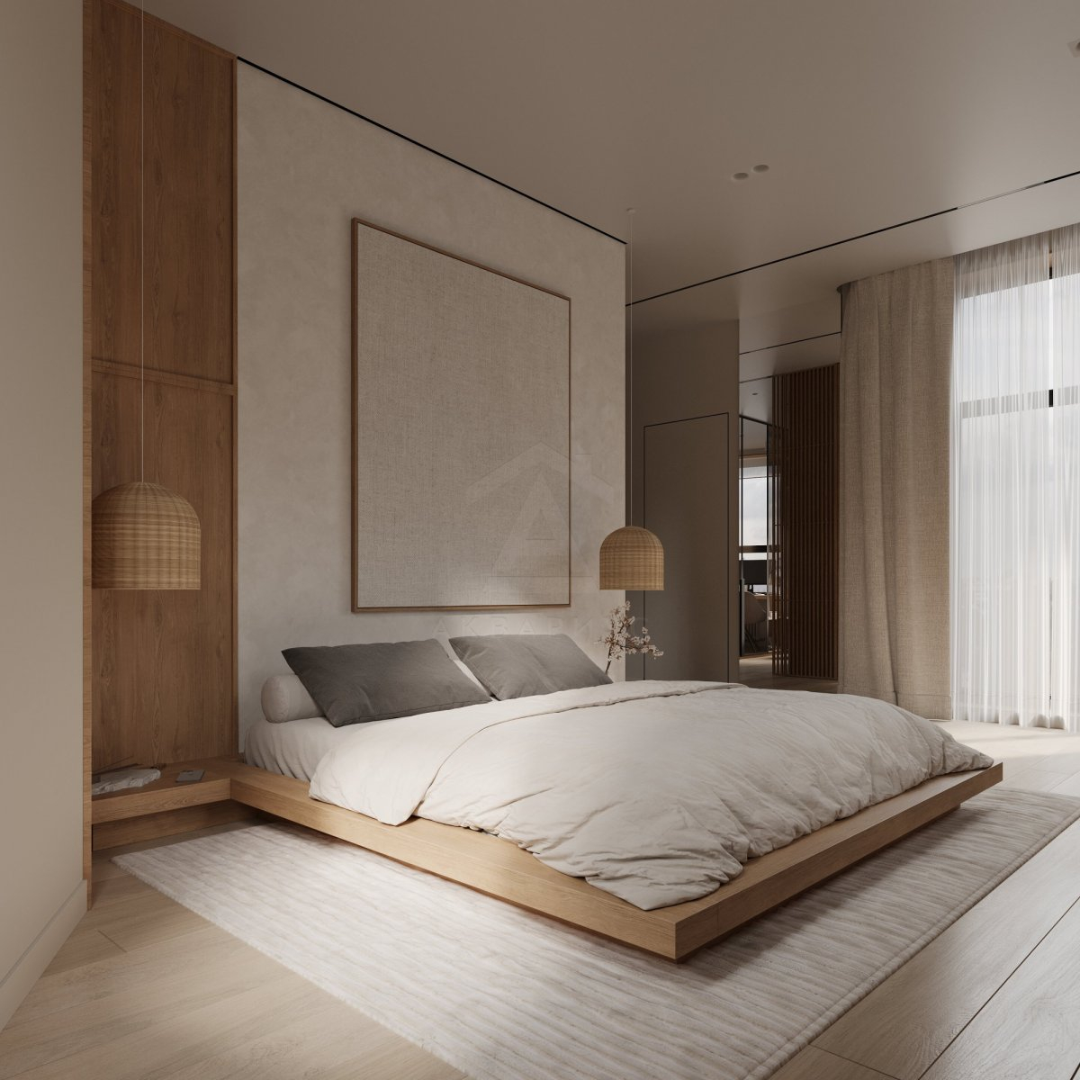 В визуализациях спальни важно показать объем комнаты, чтобы видны были места проходов и габариты кровати, фактура тканей и штор.